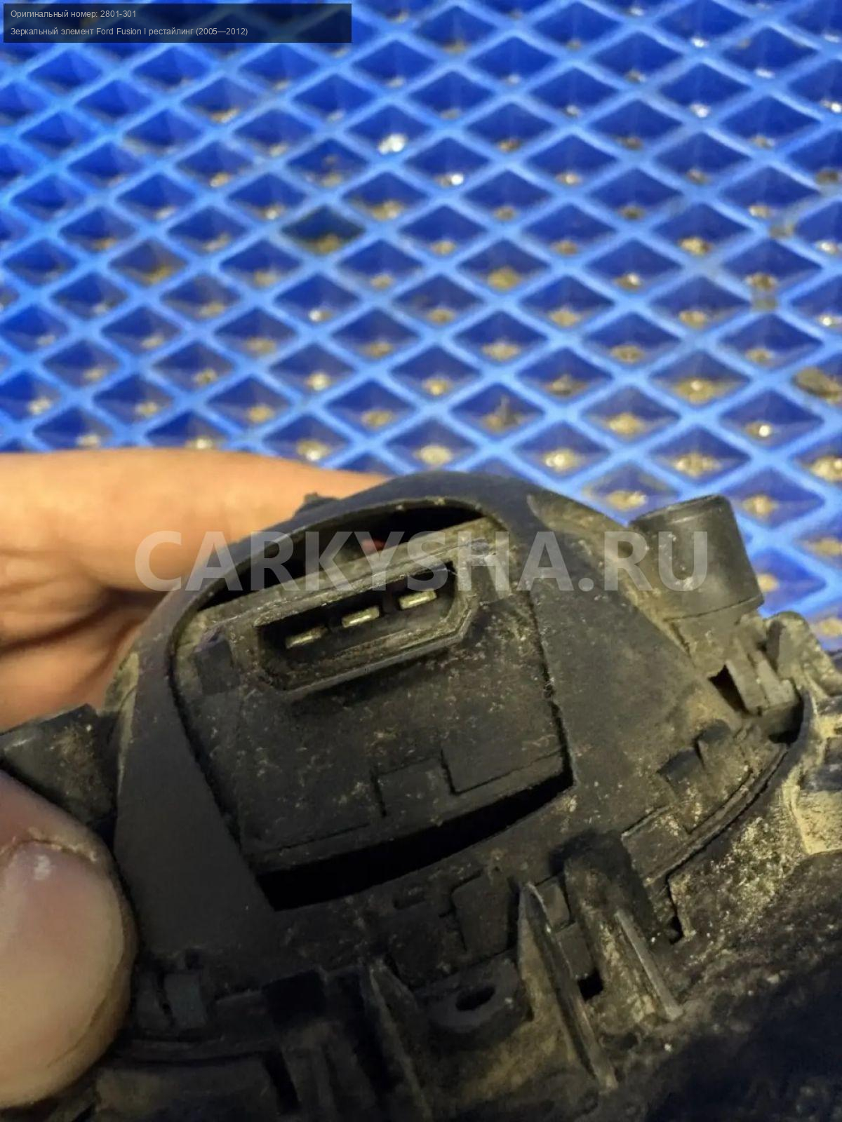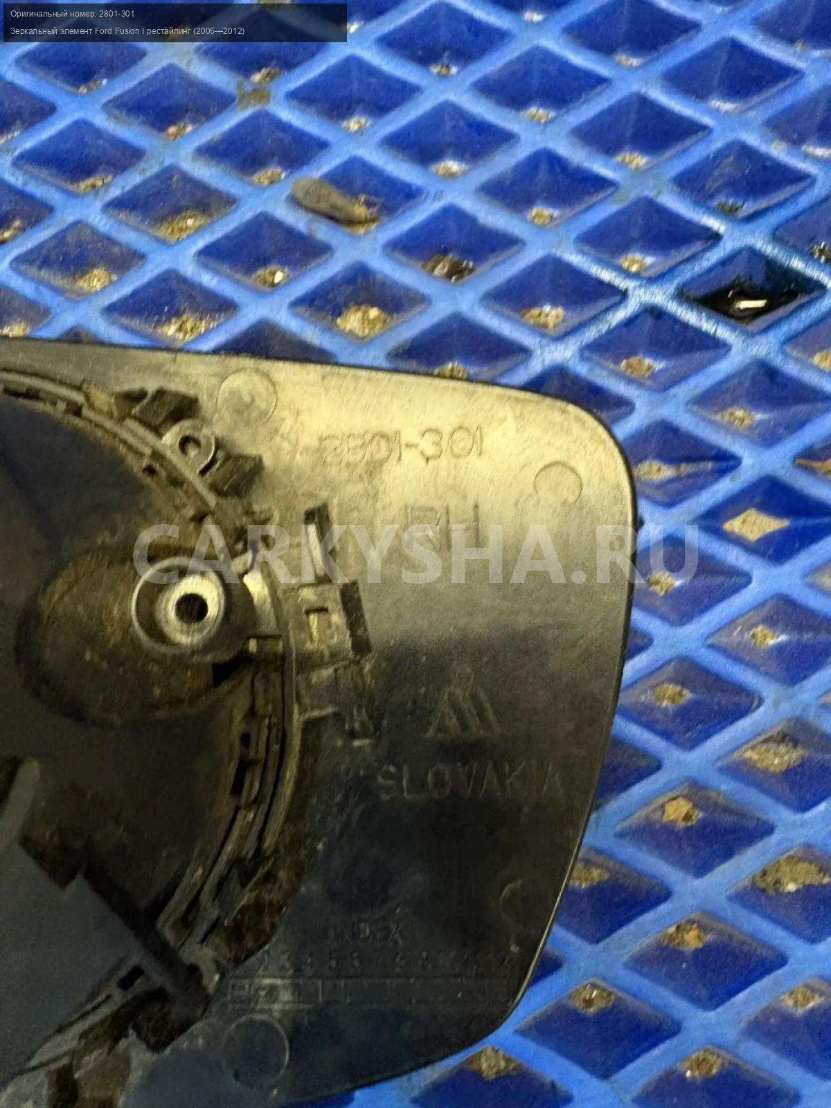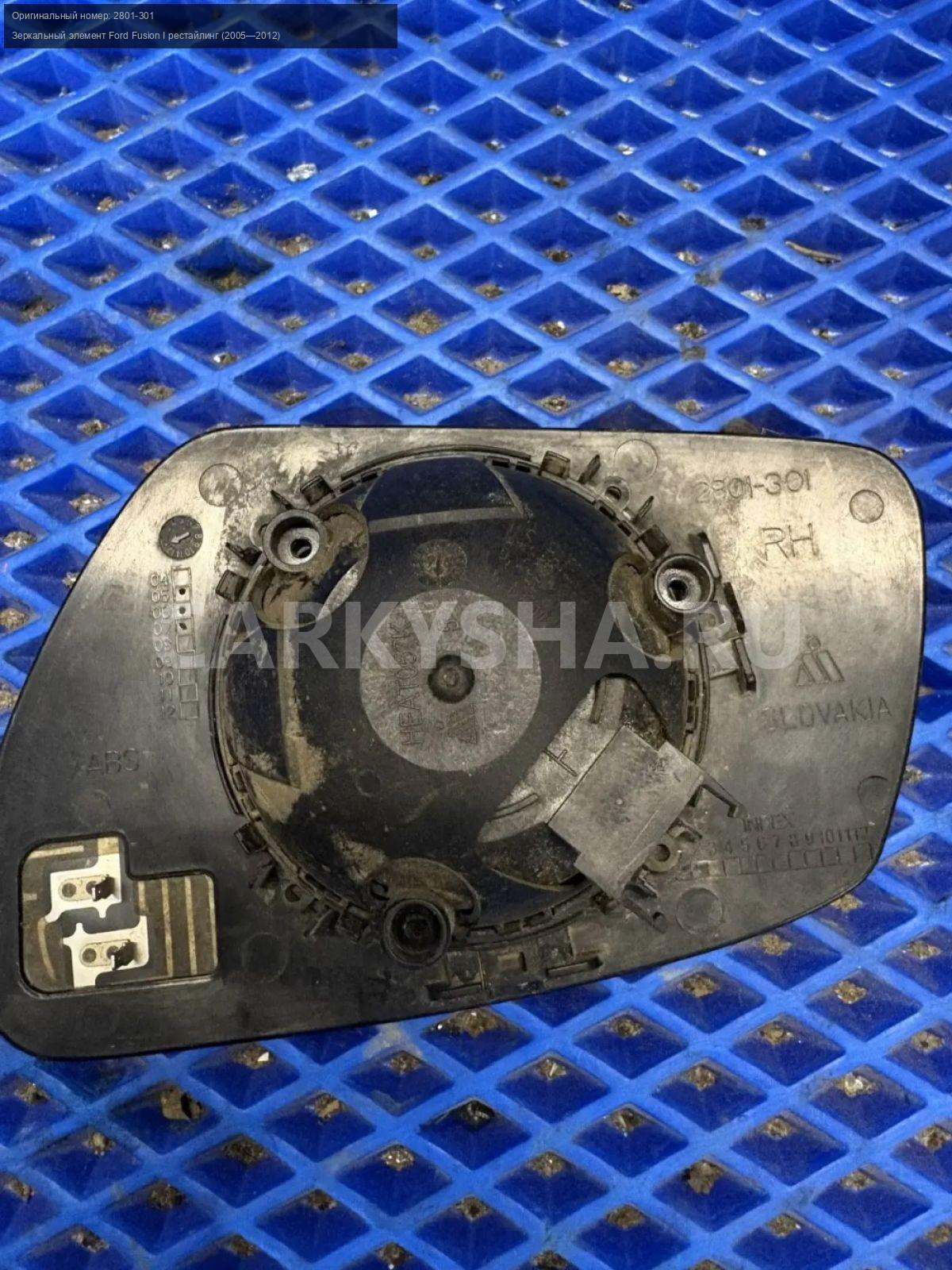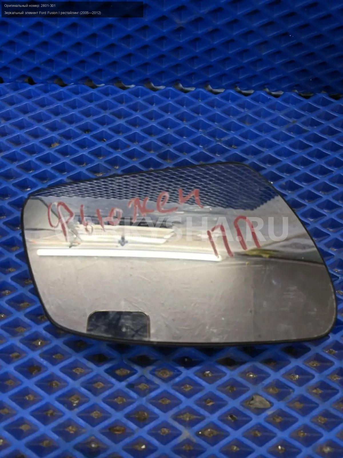 Ford Fusion, зеркальный элемент правый с подогрево\nАртикул: 10279\n\nОриг. номер: 2801-301\nПроизводитель: FORD\nПримечание:Форд Фьюжн, зеркальный элемент правого зеркала, с подогревом, б/у. \n\nМарка: Ford\nМодель: Fusion I рестайлинг (2005—2012)\nГод выпуска: 2008\nКузов тип: Хетчбэк\nДвигатель номер: FYJA\nМодель двигателя: инжектор\nОбъем: 1.6\nТопливо: Бензин\nКоробка: Механика\nЦвет: Зеленый\nПраво/Лево: Право\nСовместимости: Ford Fusion I рестайлинг (2005—2012) 1.6 MT (101 л.с.)\nСовместимость: